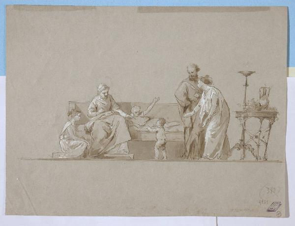 Recto: a penna, inchiostro bruno, acquerello bruno, biacca e tracce di matita su carta tinta grigio bruna. Verso: a matita e gessetto bianco su carta grigio bruna.