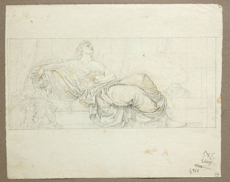 - NOTIZIE STORICO CRITICHE Il foglio, come gli altri di Michele Bisi, è conservato in un album rilegato in pelle, con fregi dorati e la scritta, al centro, "Michele Bisi. Disegni".\nQuesto disegno fa parte di una serie di copie che Michele Bisi trasse dalle "Allegorie dei Continenti", dipinte da Andrea Appiani nel 1809 sulle pareti della "Sala dei Principi" in Palazzo Reale a Milano. Gli affreschi di Appiani, minutamente descritti da Giuseppe Beretta nel 1848 (G. Beretta "Le opere di Andrea Appiani. Commentario", Milano 1848, pp. 269-272), sono andati perduti durante la seconda guerra mondiale: dell' "Asia" esiste, però, una vecchia foto, pubblicata nel 1936 da Antonio Morassi (cfr. A. Morassi "Il Palazzo Reale di Milano", Roma 1936, p. 45). La copia eseguita da Bisi, assai fedele, era con ogni probabilità preparatoria per una incisione: ma il progetto non fu mai realizzato; né dell' "Asia", né delle altre due "Allegorie dei Continenti" si trova traccia, infatti, nella raccolta di opere di Appiani che Michele Bisi incise e pubblicò nel 1820 (M. Bisi "Incisioni delle opere del pittore Cav.re Andrea Appiani dedicate a S.A.I. il granduca Michele di Russia e pubblicate dell'incisore Michele Bisi", Milano, per Nicolò Bettoni, 1820; esemplare presso la "Civica Raccolta delle Stampe Achille Bertarelli", Milano; segnatura Vol. BB. 171).\nPresso la "Civica Raccolta" Bertarelli di Milano sono conservate altre due raccolte di stampe tratte da opere di Appiani, in parte realizzate da Michele Bisi, e solitamente non citate dalla letteratura sull'artista . La prima è un album di cinque tavole sciolte, del tutto privo di note tipografiche (Bertarelli, Vol. BB. 171/ 1): le stampe riproducono l' "Aria" e il "Fuoco", due delle quattro "Allegorie degli elementi" che Appiani aveva dipinto a monocromo sopra le porte della "Sala dei Principi" di Palazzo Reale, e il "Giorno" che, con la "Notte", completava la serie di sei sovrapporte della sala (ora perdute); l' "Olimpo"; e infine la "Temperanza", una delle "Virtù" dipinte a fresco nella "Sala del Trono" in Palazzo Reale (ora a Tremezzo, Villa Carlotta). La seconda raccolta è un volume rilegato, privo di note tipografiche (Bertarelli, Vol. BB. 358) e di testo di accompagnamento: le tavole incise sono quelle già comprese nel testo pubblicato da Michele Bisi nel 1820, con l'eccezione dell' "Apollo e Giacinto", e le altre conservate nell'album segnato Vol. BB. 171/ 1. Della storia di questi due volumi non sappiamo nulla: se siano curati ancora da Michele Bisi, o raccolte successive composte da un collezionista; è possibile, tuttavia, che Bisi o l'editore Bettoni avessero pensato ad una seconda serie di incisioni da opere di Appiani, dopo quella pubblicata nel 1820; e a questo progetto erano forse destinate le tavole con le "Allegorie" a monocromo della "Sala dei Principi" e la "Temperanza", ora incluse nell'album della Raccolta Bertarelli, e le copie, mai incise, delle "Allegorie dei Continenti" e di un'altra delle "Virtù" della "Sala del Trono", la "Fortezza".