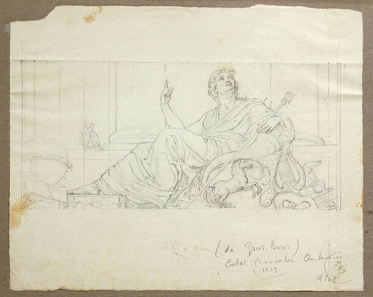 - NOTIZIE STORICO CRITICHE Il foglio, come gli altri di Michele Bisi, è conservato in un album rilegato in pelle, con fregi dorati e la scritta, al centro, "Michele Bisi. Disegni".\nSecondo Riccardo Lampugnani il disegno era forse uno studio preparatorio eseguito da Giuseppe Bosssi per la "Riconoscenza" conservata presso la Pinacoteca Ambrosiana di Milano : a questa ipotesi allude infatti la nota a matita posta sul recto del foglio, in basso a destra. Il disegno, in realtà, appartiene alla serie di copie che Michele Bisi trasse dalle "Allegorie dei Continenti", dipinte da Andrea Appiani nel 1809 sulle pareti della "Sala dei Principi" in Palazzo Reale a Milano. Gli affreschi di Appiani, minutamente descritti da Giuseppe Beretta nel 1848 (G. Beretta "Le opere di Andrea Appiani. Commentario", Milano 1848, pp. 269-272), sono andati perduti durante la seconda guerra mondiale: dell' "Europa" non esiste nessuna fotografia e neppure, a mia conoscenza, traduzioni a stampa. La descrizione che ne dà il Beretta corrisponde però perfettamente al disegno realizzato da Michele Bisi: "(...) L'Europa è abbigliata riccamente e posa su un seggio aurato, ornato da due corni di abbondanza, e di un cavallo, effigiato a bassorilievo. Gli emblemi di scienze, arti e commercio la circondano. Stringe nella sinistra lo Scettro, l'indice della destra alzando. (...) Sul fondo del dipinto appare un peristilio ornato di colonne (...)". La copia eseguita da Bisi, che è la sola documentazione esistente dell'affresco distrutto, mai fotografato e mai riprodotto in stampe successive, era con ogni probabilità preparatoria per una incisione: ma il progetto non fu realizzato; né dell' "Europa", né delle altre due "Allegorie dei Continenti" si trova traccia, infatti, nella raccolta di opere di Appiani che Michele Bisi incise e pubblicò nel 1820 (M. Bisi "Incisioni delle opere del pittore Cav.re Andrea Appiani dedicate a S.A.I. il granduca Michele di Russia e pubblicate dell'incisore Michele Bisi", Milano, per Nicolò Bettoni, 1820; esemplare presso la "Civica Raccolta delle Stampe Achille Bertarelli", Milano; segnatura Vol. BB. 171).\nPresso la "Civica Raccolta" Bertarelli di Milano sono conservate altre due raccolte di stampe tratte da opere di Appiani, in parte realizzate da Michele Bisi, e solitamente non citate dalla letteratura sull'artista . La prima è un album di cinque tavole sciolte, del tutto privo di note tipografiche (Bertarelli, Vol. BB. 171/ 1): le stampe riproducono l' "Aria" e il "Fuoco", due delle quattro "Allegorie degli elementi" che Appiani aveva dipinto a monocromo sopra le porte della "Sala dei Principi" di Palazzo Reale", e il "Giorno" che, con la "Notte, completava la serie delle sovrapporte della sala (ora perdute); l' "Olimpo"; e infine la "Temperanza", una delle "Virtù" dipinte a fresco nella "Sala del Trono" in Palazzo Reale (ora a Tremezzo, Villa Carlotta). La seconda raccolta è un volume rilegato, privo di note tipografiche (Bertarelli, Vol. BB. 358) e di testo di accompagnamento: le tavole incise sono quelle già comprese nel testo pubblicato da Michele Bisi nel 1820, con l'eccezione dell' "Apollo e Giacinto", e le altre conservate nell'album segnato Vol. BB. 171/ 1. Della storia di questi due volumi non sappiamo nulla: se siano curati ancora da Michele Bisi, o raccolte successive composte da un collezionista; è possibile, tuttavia, che Bisi o l'editore Bettoni avessero pensato ad una seconda serie di incisioni da opere di Appiani, dopo quella pubblicata nel 1820; e a questo progetto erano forse destinate le tavole con le "Allegorie" a monocromo della "Sala dei Principi" e la "Temperanza", ora incluse nell'album della Raccolta Bertarelli, e le copie, mai incise, delle "Allegorie dei Continenti" e di un'altra delle "Virtù" della "Sala del Trono", la "Fortezza".