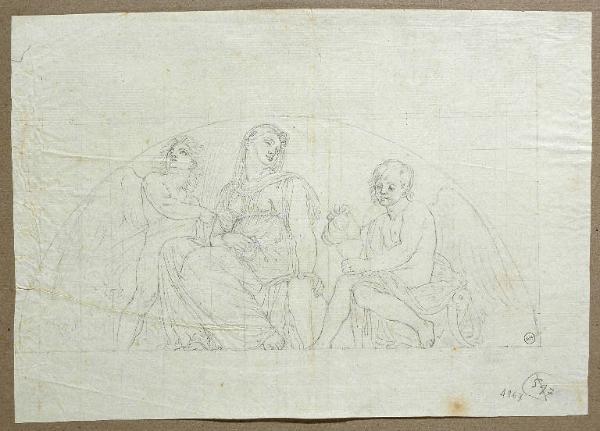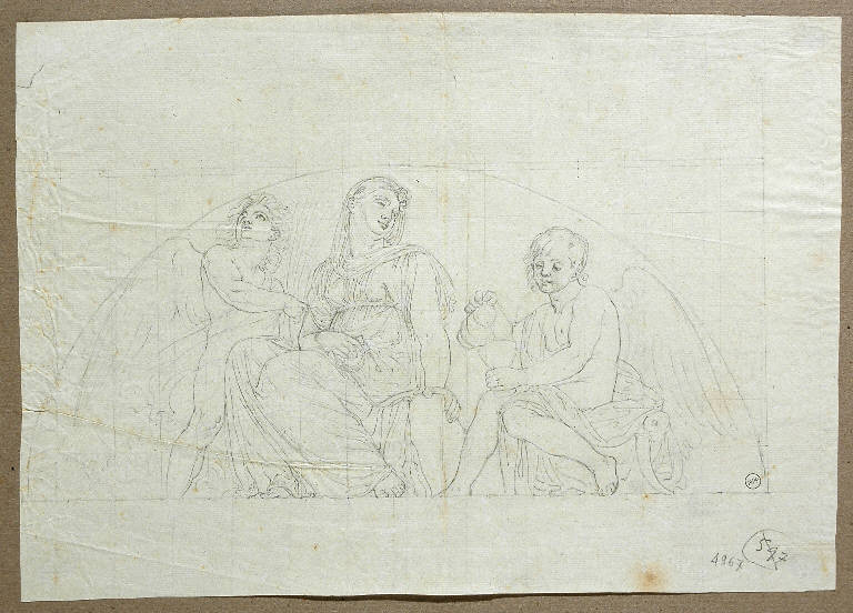 - NOTIZIE STORICO CRITICHE Il foglio, come gli altri di Michele Bisi, è conservato in un album rilegato in pelle, con fregi dorati e la scritta, al centro, "Michele Bisi. Disegni".\nIl disegno è una copia fedele dell'affresco con la "Temperanza", eseguito da Andrea Appiani nel 1808 sulle pareti della "Sala del Trono" in Palazzo Reale a Milano. Le quattro Virtù Cardinali (Giustizia, Prudenza, Fortezza e Temperanza), entro lunette, erano disposte attorno al medaglione ottagonale con l'"Apoteosi di Napoleone" che ornava il centro della volta: durante la seconda guerra mondiale, per ragioni di sicurezza, gli affreschi furono staccati e ricoverati, provvisoriamante, presso la Villa Carlotta di Tremezzo. La collocazione è poi diventata definitiva: gli affreschi sono oggi esposti nella sala detta di "Amore e Psiche", al primo piano del Museo. \nMichele Bisi eseguì le copie di due delle Virtù della Sala del Trono", la "Temperanza" e la "Fortezza": una sola, però, la "Temperanza", fu poi incisa; il compito fu affidato a Mauro Gandolfi, ma la stampa non fu inclusa nella raccolta di incisioni tratte da opere di Appiani che Bisi pubblicò nel 1820 (M. Bisi "Incisioni delle opere del pittore Cav.re Andrea Appiani dedicate a S.A.I. il granduca Michele di Russia e pubblicate dell'incisore Michele Bisi", Milano, per Nicolò Bettoni, 1820; esemplare presso la "Civica Raccolta delle Stampe Achille Bertarelli", Milano; segnatura Vol. BB. 171). La "Temperanza" compare invece in altre due raccolte, in parte realizzate da Michele Bisi, e solitamente non citate dalla letteratura sull'artista . La prima è un album di cinque tavole sciolte, del tutto privo di note tipografiche (Bertarelli, Vol. BB. 171/ 1): le stampe riproducono l' "Aria e il "Fuoco", due delle quattro "Allegorie degli elementi" che Appiani aveva dipinto a monocromo sopra le porte della "Sala dei Principi" di Palazzo Reale, e il "Giorno" che, con la "Notte", completava la serie di sovrapporte della sala (Ora perdute); l' "Olimpo"; e infine la "Temperanza" un tempo in Palazzo Reale, appunto. La seconda raccolta è un volume rilegato, privo di note tipografiche (Bertarelli, Vol. BB. 358) e di testo di accompagnamento: le tavole incise sono quelle già comprese nel testo pubblicato da Michele Bisi nel 1820, con l'eccezione dell' "Apollo e Giacinto" e l'aggiunta della serie di cinque conservata nell'album Bertarelli segnato Vol. BB. 171/ 1. Della storia di questi due volumi non sappiamo nulla: se siano curati ancora da Michele Bisi, o raccolte successive composte da un collezionista; è possibile, tuttavia, che Bisi o l'editore Bettoni avessero pensato ad una seconda serie di incisioni da opere di Appiani, dopo quella pubblicata nel 1820; e a questo progetto erano forse destinate le tavole con le "Allegorie" a monocromo della "Sala dei Principi" e la "Temperanza", ora incluse nell'album della Raccolta Bertarelli, e le copie, mai incise, delle "Allegorie dei Continenti" e di un'altra delle "Virtù" della "Sala del Trono", la "Fortezza".