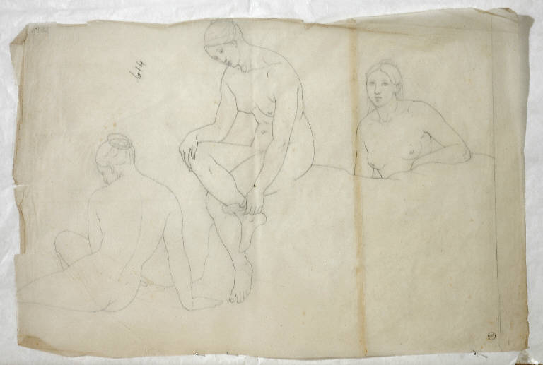 - NOTIZIE STORICO CRITICHE Il foglio, come gli altri di Michele Bisi, è conservato in un album rilegato in pelle, con fregi dorati e la scritta, al centro, "Michele Bisi. Disegni".\nIl disegno è forse uno studio preparatorio per l'acquerello che Michele Bisi presentò alla mostra annuale dell'Accademia di Brera nel 1852: "...dipinto all'acquerello rappresentante diverse donne che si bagnano in un luogo campestre. Di commissione del sig. marchese Paolo Rescalli" (cfr. "Esposizione delle opere di Belle Arti nelle Gallerie dell' I.R. Academia per l'anno 1852", Milano 1852, p. 21, n° 119). Due figure femminili assai simili a queste, ritratte in atteggiamenti diversi, compaiono in un altro foglio di Michele Bisi conservato nella collezione di Riccardo Lampugnani (inv. 4982): e ugualmente legato, con ogni probabilità, per l'identico tratto netto e pulito, all'acquerello, perduto, del 1852.