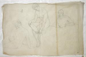 A matita su carta da ricalco, lucida e trasparente. Il foglio è composto in realtà da due parti di diverse dimensioni, giuntate con colla: sul foglio più piccolo (base cm 125 circa), posto a destra, è tracciato uno studio di figura femminile a mezzo busto, vista frontalmente; sul foglio più grande, altri due nudi di donna: la prima, in basso a sinistra, seduta e ritratta di schiena; la seconda, vista di fronte, la gamba destra accavallata, è colta nell'atto di togliersi una calza.
