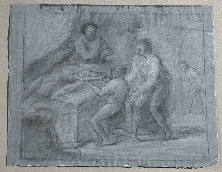 - NOTIZIE STORICO CRITICHE Una foto del disegno, datata marzo 1973, è conservata nell'album D. 3: il foglio è quindi entrato nella raccolta di Riccardo Lampugnani prima di questa data. Accanto all'immagine, il collezionista milanese ha scritto qualche rapido appunto: "Ranzoni, della cerchia del Piccio? - prof. Rossi, Carrara, 1974/ nella cartella del Piccio". Questa scena biblica, in realtà, sembra assai vicina, per tecnica e stile, al foglio con "Mercurio uccide Argo" (inv. 5108), che una scritta antica assegna al pittore friulano Jacopo D'Andrea (Rauscedo, Pordenone 1819 - Venezia 1906): è identico, infatti, il segno veloce, ma un po' greve, della matita nera; identico l'uso del gesso bianco, steso a illuminare forme larghe e morbide, ora a tocchi densi, ora a tratti rapidi e nervosi; identico il modo di marcare, sui volti, brevi tratti orizzontali, o punti, a indicare rapidamente occhi, naso e bocca dei personaggi; ed è identico, infine, l'uso della carta preparata ad acquerello grigio/ azzurro. I pochi disegni noti del pittore friulano non consentono, tuttavia, di confermare con certezza l'attribuzione.