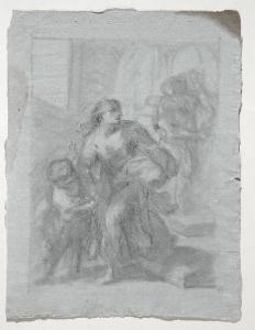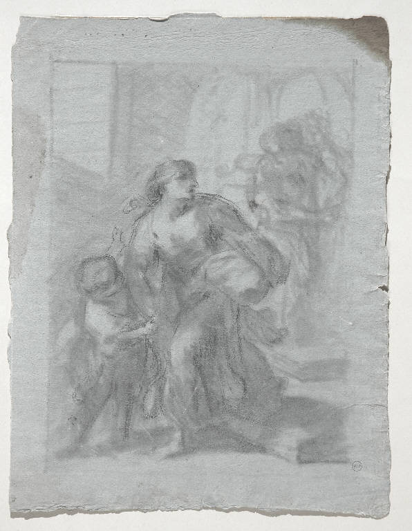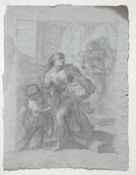 - NOTIZIE STORICO CRITICHE Questa scena biblica sembra assai vicina, per tecnica e stile, al foglio con "Mercurio uccide Argo" (inv. 5108), che una scritta antica assegna al pittore friulano Jacopo D'Andrea (Rauscedo, Pordenone 1819 - Venezia 1906): è identico, infatti, il segno veloce, ma un po' greve, della matita nera; ed è identico il modo di marcare, sui volti, brevi tratti orizzontali, o punti, a indicare rapidamente ochhi, naso e bocca dei personaggi. I pochi disegni noti del pittore friulano non consentono, tuttavia, di confermare con certezza l'attribuzione.