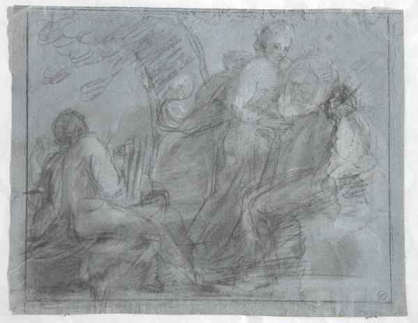 - NOTIZIE STORICO CRITICHE Questa scena mitologica, di difficile lettura sembra assai vicina, per tecnica e stile, al foglio con "Mercurio uccide Argo" (inv. 5108), che una scritta antica assegna al pittore friulano Jacopo D'Andrea (Rauscedo, Pordenone 1819 - Venezia 1906): è identico, infatti, il segno veloce, ma un po' greve, della matita nera; identico l'uso del gesso bianco, steso ora a tocchi densi, ora a tratti rapidi e nervosi; identico il modo di marcare, sui volti, brevi tratti orizzontali, o punti, a indicare rapidamente occhi, naso e bocca dei personaggi; ed è identico, infine, l'uso della carta preparata ad acquerello grigio/ azzurro. I pochi disegni noti del pittore friulano non consentono, tuttavia, di confermare con certezza l'attribuzione.