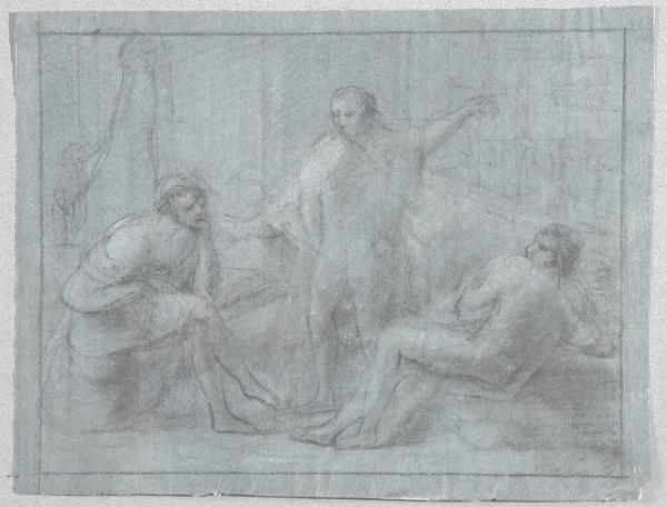 - NOTIZIE STORICO CRITICHE Questa scena mitologica, di difficile lettura, sembra assai vicina, per tecnica e stile, al foglio con "Mercurio uccide Argo" (inv. 5108), che una scritta antica assegna al pittore friulano Jacopo D'Andrea (Rauscedo, Pordenone 1819 - Venezia 1906): è identico, infatti, il segno veloce, ma un po' greve della matita nera; identico l'uso del gesso bianco, steso a illuminare forme larghe e morbide, ora a tocchi densi, ora a tratti rapidi e nervosi; identico il modo di marcare, sui volti, brevi tratti orizzontali, o punti, a indicare rapidamente occhi, naso e bocca dei personaggi; ed è identico, infine, l'uso della carta preparata ad acquerello grigio/ azzurro. I pochi disegni noti del pittore friulano non consentono, tuttavia, di confermare con certezza l'attribuzione.