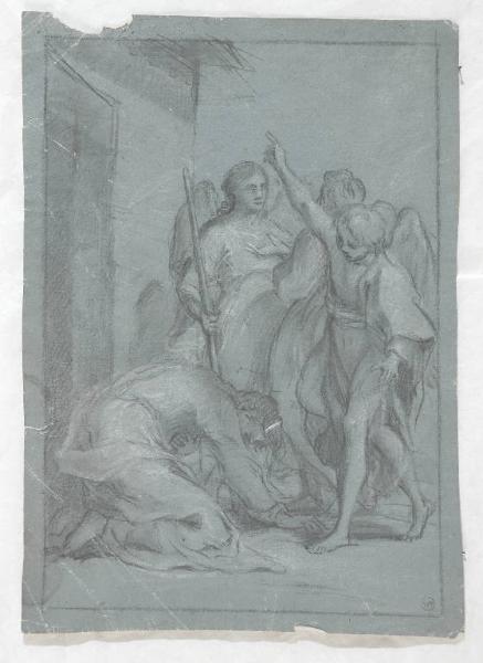- NOTIZIE STORICO CRITICHE Riccardo Lampugnani ha annotato alcuni appunti sul cartoncino di supporto: "Piccio e suoi allievi? Mani diverse", "Diotti!!" disegno a Cremona prof. Rossi". Questa scena con il "Congedo di Tobiolo", in realtà, sembra assai vicina, per tecnica e stile, al foglio con "Mercurio uccide Argo" (inv. 5108), che una scritta antica assegna al pittore friulano Jacopo D'Andrea (Rauscedo, Pordenone 1819 - Venezia 1906): è identico, infatti, il segno veloce, ma un po' greve della matita nera; identico l'uso del gesso bianco, steso a illuminare forme larghe e morbide, ora a tocchi densi, ora a tratti rapidi e nervosi; identico il modo di marcare, sui volti, brevi tratti orizzontali, o punti, a indicare rapidamente occhi, naso e bocca dei personaggi; ed è identico, infine, l'uso della carta preparata ad acquerello grigio/ azzurro. I pochi disegni noti del pittore friulano non consentono, tuttavia, di confermare con certezza l'attribuzione.