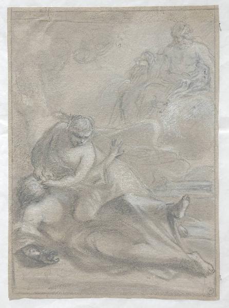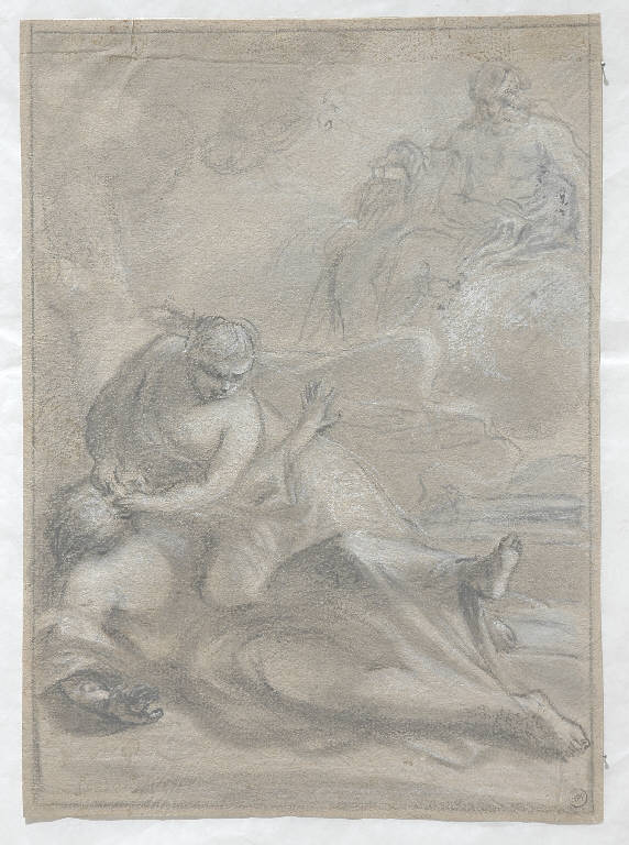 - NOTIZIE STORICO CRITICHE Questa scena mitologica con "Giunone che toglie gli occhi ad Argo", sembra assai vicina, per tecnica e stile, al foglio inv. 5108 ("Mercurio uccide Argo"), che una scritta antica assegna al pittore friulano Jacopo D'Andrea (Rauscedo, Pordenone 1819 - Venezia 1906): è identico, infatti, il segno veloce, ma un po' greve, della matita nera; identico l'uso del gesso bianco, steso a illuminare forme larghe e morbide, ora a tocchi densi, ora a tratti rapidi e nervosi; identico, infine, il modo di marcare, sui volti, brevi tratti orizzontali, o punti, a indicare rapidamente occhi, naso e bocca dei personaggi. I pochi disegni noti del pittore friulano non consentono, tuttavia, di confermare con certezza l'attribuzione.