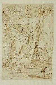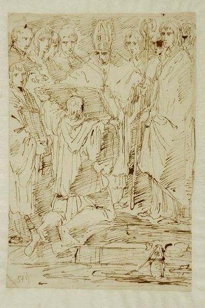 - NOTIZIE STORICO CRITICHE Il foglio è stato esposto alla mostra dedicata alla collezione di Riccardo Lampugnani che il Museo Poldi Pezzoli ha organizzato nel 1997 ("Riccardo Lampugnani: una collezione milanese donata al museo Poldi Pezzoli", Milano 1997, p. 20, n° 36), con una attribuzione a Felice Giani che è senz'altro da confermare: il disegno, infatti, per il segno di contorno secco ed essenziale, per il tratteggio largo e fortemento segnato sembra molto vicino ad alcuni fogli che l'artista esegue attorno al 1790; si veda, in particolare, la "Predica di un curato" a penna e inchiostrro nero della Pinacoteca Nazionale di Bologna (cfr. A. Ottani Cavina "Felice Giani 1758-1823 e la cultura di fine secolo", Milano 1999, vol.2, p. 705, fig. 1008).