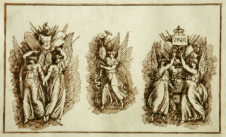 Riquadrato a penna. A penna e inchiostro nero su carta bianca, spessa. Studio per una "Allegoria della vittoria", in tre diverse versioni: a sinistra, schizzo di due figure femminili alate con panoplia di elmi, corazze e scudi; al centro, schizzo di una figura femminile alata con insegne militari; a destra, schizzo di due figure femminili alate con insegna "S.P.Q.R." e panoplia di armi.