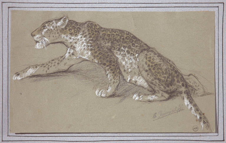 - NOTIZIE STORICO CRITICHE L'impaginazione del soggetto e la posizione della firma, ben leggibile, a destra sotto la zampa poteriore dell'animale, si ritrovano in un disegno datato intorno al 1850 del pittore animalista belga Eugène Verboeckhoven (1798-1881), che aveva un atelier a Bruxelles dove formò molti allievi. La datazione è proposta tenendo conto della resa naturalistica, ereditata dalla trattazione dei soggetti di animali selvaggi da parte dei pittori del periodo romantico, e dell'analogia con il disegno citato, rispetto al quale questo appare decisamente posteriore per la maggiore attenzione alla resa del chiaroscuro e dei dettagli, elementi che, insieme alla resa più ravvicinata dell'animale, confersicono un aspetto quasi "simbolista" al disegno. Due foto a colori sono conservate nell' album D15, con la scritta a pennarello verde "838" e nell'album D6 1800-1900, con la scritta a pennarello rosso "155".