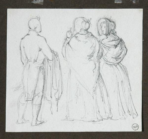 - NOTIZIE STORICO CRITICHE L'attribuzione a Migliara è ipotizzata sulla base della buona qualità stilistica del disegno e del confronto con i disegni dei taccuini di Migliara conservati presso la Pinacoteca Civica di Alessandria (Rosci, Gozzoli 1977), confronto che permette di notare analogie nel modo di schizzare le figure con un tratto deciso e sciolto. La datazione è motivata dal tipo di abbigliamento delle tre figure (che si ritrova nei disegni in ibidem, nn. 69 e 53v, dall'Album 1, e 435v, dall'Album n. 6). E' plausibile ritenere che le dimensioni del foglio (mm 110x121) fossero originariamente maggiori di qualche centimetro e analoghe a quelle dei taccuini (generalmente mm 130x200 circa), e che esse siano ascrivibili a un'operazione di ritaglio del foglio fatta successivamente.