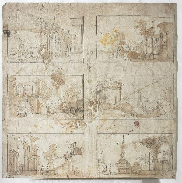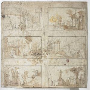 Sei piccoli capricci con rovine classiche e figurini. Architetture