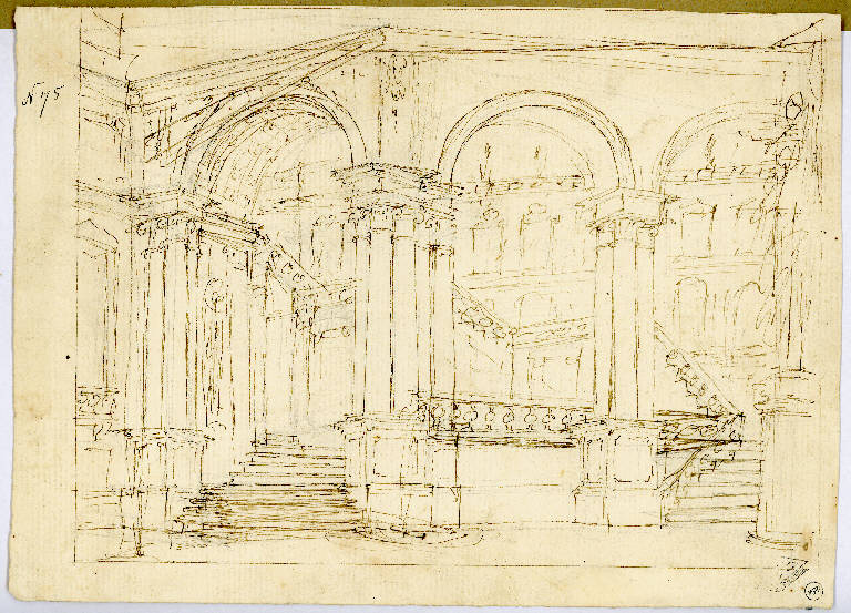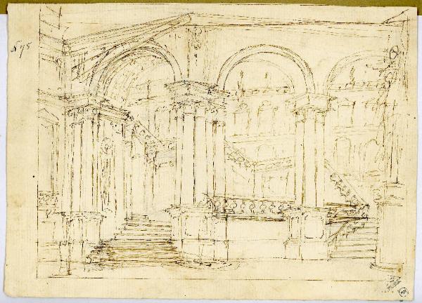 - NOTIZIE STORICO CRITICHE Il disegno appare vicino alla maniera dei Bibiena ed è forse accostabile ai modi di Francesco Orlandi (Bologna 1681-1760)(cfr. "Architettura, Scenografia, Pittura di paesaggio. X Biennale d'arte antica. L'arte del Settecento emiliano", Bologna 1979), anche se denota un fare maggiormente esemplificato. Si veda in tal senso gli schizzi per scenografie quali l' "Atrio regio con scale" del 1776 conservato presso il Gabinetto di Disegni e stampe della Pinacoteca Nazionale di Bologna proveniente dalla collezione Pepoli e realizzato per il Teatro Pubblico di Reggio Emilia, prima attribuito a Paolo Dardani o genericamente riferito all'ambito bibienesco. L'influsso evidente dei Bibiena si coglie nel modo di sdoppiare la scalinata per amplificare lo spazio, chiuso nello sfondo dall'edificio con loggiato al piano inferiore sormontato da finestre di varia decorazione (a timpano, con rocailles) con statue sovrapposte.