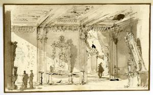 - NOTIZIE STORICO CRITICHE Il disegno appare vicino alla maniera di Bernardino Bison (1762-1844) per il modo di ombreggiare ad acquerello e per il tratto nervoso: si veda in tal senso l'"Atrio di un palazzo" in collezione privata e "Sosta presso un capitello" del Gabinetto di Disegni e Stampe dello Staatliche Museum di Berlino, entrambi a penna ed acquerello su carta, di cui l'ultimo autografo del pittore, e le "Tombe monumentali", nella medesima tecnica, dell'Albertina di Vienna (cfr. Cera, 2002, nn. 22, 38 e 25). Si veda in tal senso anche la "Reggia di Apollo" conservata presso il Museo Teatrale alla Scala di Milano, attribuita al Bison (n. 2162 del catalogo, fig. 950). Per altri aspetti, quali ad esempio la maniera più dettagliata di accennare gli oggetti ed il modo arioso di comporre la scena potrebbe essere opportuno circoscriverlo genericamente all'ambito veneto. Sul supporto del disegno si segnala l'indicazione fornita dal collezionista Lampugnani "Marco Ricci - disegno simile visto (...) v. Bisson?". Il riferimento al Ricci sembra comunque da escludere.