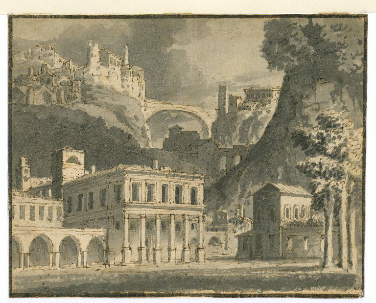 - NOTIZIE STORICO CRITICHE Sul supporto compare ripetutamente la scritta "Sanquirico" apposta sicuramente dal collezionista Lampugnani. Il riferimento al Sanquirico (1777-1849), scenografo operoso alla Scala, allievo di G. Perego, ed assai attivo nella prima metà dell'Ottocento, sembra accettabile, soprattutto per l'impronta ed il gusto per il pittoresco di stampo romantico, benchè il disegno mostri anche analogie con il tratto delle scenografie realizzate da Giuseppe Bertoja (1808-1873), attivo a Venezia (dove lavorerà per la messa in scena delle opere di Giuseppe Verdi e ove si conserva il nucleo più consistente delle sue scenografie, donate dal nipote Carlo, ora presso il Museo Correr) e a Torino per il Regio, insieme a Luigi Vacca.