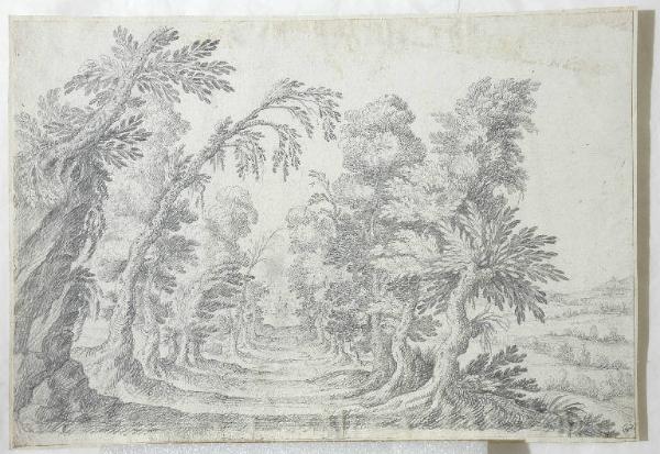 - NOTIZIE STORICO CRITICHE Il disegno appare costruito in modo tale da poter far pensare che si tratti probabilmente di una scenografia. Il tipo di fronde e la disposizione delle piante come quinta arborea e come galleria evidenzia alcune analogie con il "Paesaggio fluviale" attribuito a Giuseppe Galli Bibiena (1695-1757), figlio di Ferdinando (1657-1743), del Deutsches Theatermuseum (inv. n. IV 3200, su cui si veda "I Bibiena, una famiglia europea" a c. D. Lenzi, 2000, n. 57 p. 290), che presenta simili fronde usate allo stesso scopo, benchè ne compaiono solo due invece delle consuete quattro coppie, come teorizzato da Ferdinando Galli Bibiena nel suo trattato. In tal senso si può vedere anche il "Bosco" per l'Endimione (1699) nell'incisione di P. Giovanni Abati della Biblioteca Nazionale di Torino (pubblicato in M. Viale Ferrero, "La scenografia del '700 e i fratelli Galliari", 1963, p. 95).