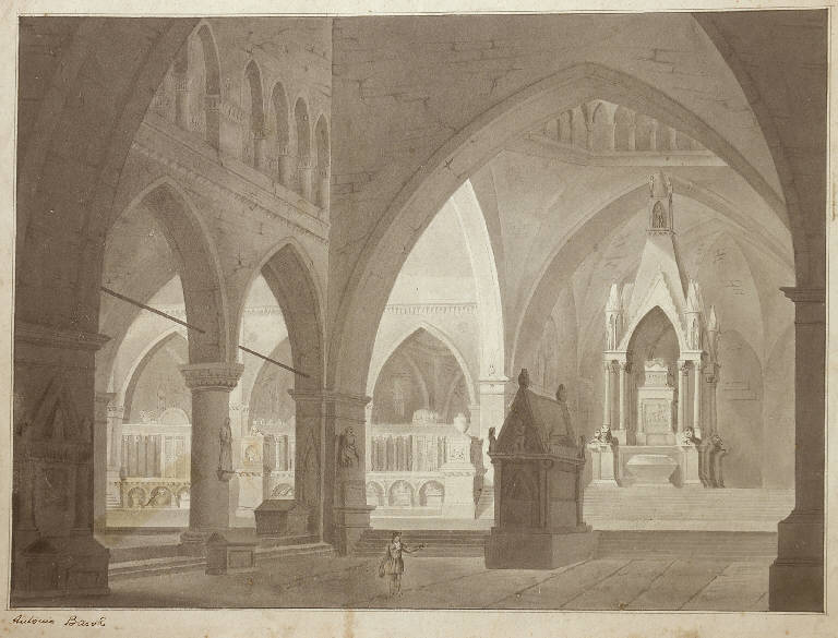 - NOTIZIE STORICO CRITICHE Il riferimento a Basoli è dato dubitativamente dallo stesso Lampugnani nel verso del foglio, autore del quale non rivela l'elevata qualità artistica presente nella maggior parte delle opere a lui attribuite. Il confronto con i disegni di scenografia di questo artista, che fu professore di architettura all'Accademia Clementina di Bologna nel 1803, ove ebbe numeosi scolari ed operò assiduamente fornendo le decorazioni per numerosi palazzi in Emilia Romagna (si veda A. M. Matteucci, "I decoratori di formazione bolognese tra '700 e '800. Da Mauro Tesi ad Antonio Basoli", Milano, 2003), quali ad esempio il "Castello con chiostro visto da un arco", realizzato probabilmente per il Trovatore di Verdi, del Museo Teatrale alla Scala di Milano (n. 2186 del catalogo) rivela qualche analogia con l'opera in esame per le arcature acute e le penombre dai forti contrasti. La consuetudine con l'allievo Francesco Cocchi (Budrio 1788-1865 Bologna), che lavorò con lui e che divulgò l'opera del maestro attraverso incisioni, potrebbe far pensare ad una riproduzione di un motivo di Basoli prodotto appunto dal Cocchi.