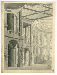 Metà scena raffigurante interno magnifico con grandiosa scalinata. Interno