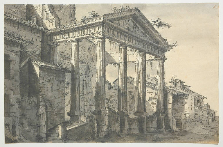 - NOTIZIE STORICO CRITICHE Questa suggestiva veduta contraddistinta dalla mole incombente del tempio dorico in declino scorciato in primo piano, che risalta sulle case modeste in muratura in cui l'intonaco caduto in più punti conferisce alla scena un che di rovina, ricorda talune composizioni romane realizzate da Giovan Battista Piranesi (1720-1778) alla fine degli anni Cinquanta del '700. Il senso malinconico della scena per la decadenza degli edifici, sui quali la vegetazione si è ormai insinuata, sembra preludere alle vedute di gusto romantico diffuse anche nel secolo successivo. Un'indicazione in tal senso è fornita dallo stesso collezionista Lampugnani sullo stesso supporto. Una simile scena, ma capovolta nell'impostazione, compare nella "Veduta del Tempio di Ercole a Cora presso Velletri", come pure nella "Veduta dell'atrio del portico di Ottavia" in cui vi sono analoghe fronde che si inseriscono tra i conci, nel "Colonnato del Pantheon" e nel "Colonnato del Tempio della Concordia", riportatti nel volume "Giambattista Piranesi" edito nel 2001 da Mazzotta (rispettivamente i nn. 118, 120, 123, 131).