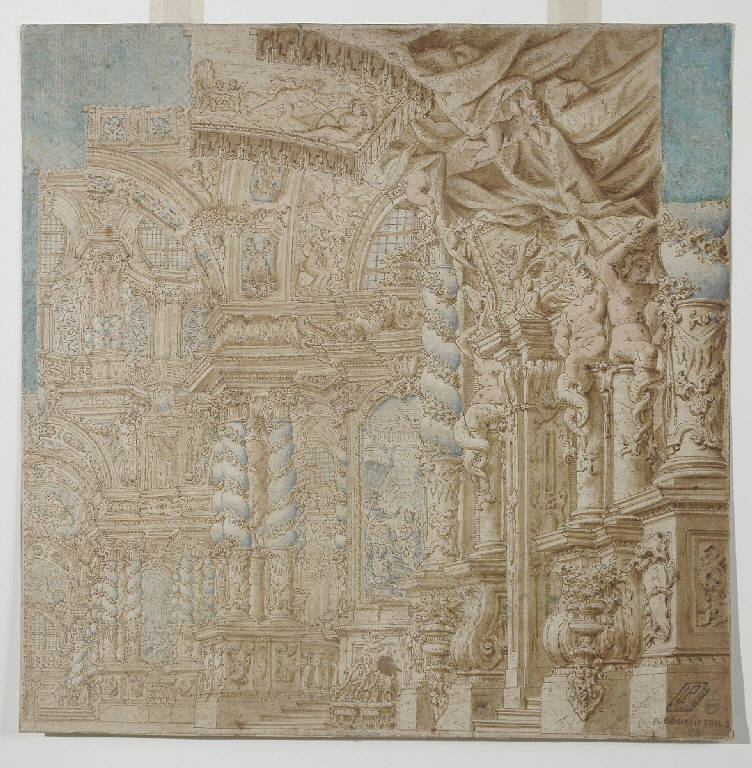 - NOTIZIE STORICO CRITICHE Questo inconsueto disegno è riferito dal cartellino e nell'inventario Lampugnani ad Angelo Boucheron, architetto, scultore e professore di disegno alla scuola dei cappuccini di Torino e poi all'Accademia Militare, disegnatore della Regia Galleria e precettore di disegno dei principi Vittorio Emanuele e Ferdinando, quindi insegnante all'Accademia, argentiere in una rara occasione (realizzò tre mazze d'argento per l'università, cfr. "Cultura figurativa e architettonica negli Stati del Re di Sardegna, 1773-1861", 1980, p. 218-21).\nIn questa scena viene proposta con grande raffinatezza disegnativa e coloristica la decorazione di un ambiente rococò ispirata in modo evidente alla maniera dei Bibiena. In particolare in tal senso appare appropriato il confronto con il disegno raffigurante la "Reggia del sole" del 1717 del Museu Nacional de Arte Antiga di Lisbona (inv. n. 316) di Francesco Galli Bibiena che si riferisce alla scena III, 14 de "La conquista del vello d'oro", dramma per musica di A. M. Bononcini (1677-1726) su libretto di Flaminio Parisetti rappresentato a Reggio Emilia nel Teatro delle Commedie di Piazza Grande, in occasione della fiera del 1717, alla presenza del Duca d'Este Rinaldo I e pervenuto nelle raccolte di Lisbona al seguito del figlio di Francesco, Giovanni Carlo Sicinio, attivo per la corte del re Giuseppe I negli ultimi otto anni della sua vita (cfr. "I Bibiena una famiglia europea", a c. D. Lenzi - J. Bentini, 2000, n. 26, pp. 261-2). Il tema della reggia era allora molto alla moda e si presentava adatto alle virtuosistiche esibizioni meccaniche, ed aveva avuto già una elaborata messa in scena a Neustadt nel 1678 con scene e macchine di Burnacini (verrà riproposto a Braunsch Weig nel 1707 e nel 1719 a Dresda, nel 1745 a Torino). Anche la "Reggia di Diana", sempre di Francesco, in uguale ubicazione (n. inv. 317, cfr. cat. n. 27, pp. 261-2) presenta analogie nel fitto assieparsi di colonne tortili decorate ma anche nella tipologia delle figure, come pure l' "Atrio con colonne tortili" del Museo Teatrale alla Scala di Milano (n. 2391 del catalogo). Tutt'oggi simili decorazioni si possono leggere nel Bayreuth Theatre creato da Giuseppe Galli Bibiena, unico teatro ancora intatto e perfettamente conservato dei vari realizzati dai Bibiena in Europa.\nSuggestiva ma non dimostrabile l'ipotesi che si tratti di uno studio bibienesco appartenuto ad Angelo Boucheron, se così fosse da leggere l'indicazione fornita dallo stesso Lampugnani sul supporto in cui indica il riferimento a disegni dei Galli Bibiena riportata da C. Ricci nella sua storia della scenografia (cfr. tavv. XLVIII, Palazzo Reale a Torino). Una fotografia del 1973 attesta la presenza del disegno in collezione Lampugnani a tale data.