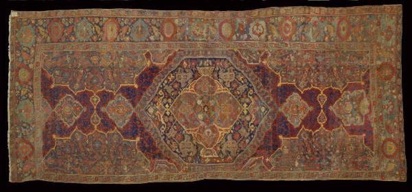 Al centro del campo fittamente percorso da un minuto tralcio vegetale con fiori di loto, palmette e tipiche "foglie di quercia" dal caratteristico profilo frastagliato è collocato un medaglione ogivale ornato da arabeschi e palmette. La rimanente porzione del campo è occupata dalla metà di altri quattro medaglioni secondari tondeggianti e polilobati che suggeriscono un andamento ripetuto all'infinito. Il medaglione centrale, dominante sul resto della composizione è completato in alto e in basso da due pendenti a goccia. In prossimità dei lati corti si scorgono le frazioni di altri due medaglioni principali con pendenti che suggeriscono nuovamente un andamento infinito. La cornice è costituita da una fascia centrale e da due bordi secondari più sottili. La bordura più larga, mancante su un lato lungo del tappeto, è costituita da motivi floreali dove si riconoscono palmette e grossi fiori tondeggianti delineati, talvolta, in modo piuttosto sommario. I due bordi secondari sono decorati con un tralcio vegetale continuo e fiorito. \nOrdito: lana; Trama: lana; Pelo: lana; Nodo: simmetrico; Densità: 600 nodi al dm2 ca.