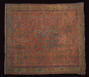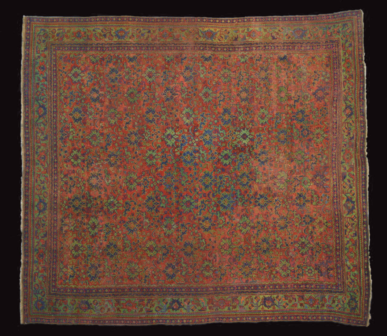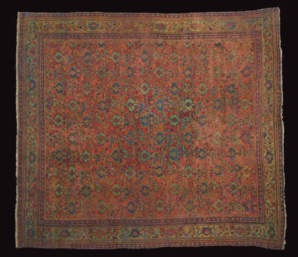 Tappeto a decorazione floreale. Il campo rosso del tappeto è interamente decorato da fiori stilizzati verdi e blu. La cornice è costituita da un duplice bordo e da una fascia centrale. I bordi, quasi identici, recano fascette decorate da motivi ondulati e il disegno di fori alternato a punte di freccia disposte nella medesima direzione. La fascia presenta palmette molto schematizzate alternate con boccioli e altre inflorescenze. Il tappeto in esame è stato attribuito a Ushak ma una provenienza persiana potrebbe essere plausibile.\nOrdito: lana; Trama: lana; Pelo: lana; Nodo: simmetrico; Densità: 300 nodi al dm2 ca.