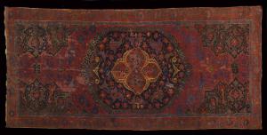 Al centro del campo fittamente percorso da un minuto tralcio vegetale con fiori di loto, palmette e tipiche "foglie di quercia" dal caratteristico profilo frastagliato è collocato un medaglione ogivale ma leggermente schiacciato e ornato da arabeschi e palmette. La rimanente porzione del campo è occupata da una porzione di altri quattro medaglioni secondari polilobati collegati da pendenti che suggeriscono un andamento ripetuto all'infinito. La cornice è costituita da una fascia centrale e da un bordo secondario più sottile. La bordura più larga è costituita da motivi floreali dove si riconoscono palmette e grossi fiori tondeggianti dal profilo leggermente frastagliato. Il bordo sottile è decorato con un tralcio vegetale continuo e fogliato. \nOrdito: lana; Trama: lana; Pelo: lana; Nodo: simmetrico; Densità: 1800 nodi al dm2 ca.