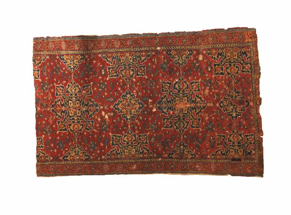 Tappeto cosiddetto "Ushak a stelle". Nel campo del tappeto, a fondo rosso, ci sono due medaglioni a forma di stella a otto punte in blu abitati da arabeschi gialli e intervallati da losanghe, anch'esse blu con arabeschi gialli. Lungo i bordi sono presenti porzioni di medaglioni e losanghe che suggeriscono un andamento all'infinito. Sul fondo si staglia una griglia con tralci fogliati che sostengono boccioli di loti e altre inflorescenze. La cornice è costituita da una fascia principale decorata da rosette alternate a foglie stilizzate e affiancata da un sottile bordo a fondo avorio. Il tappeto è bordato in feltro rosso.\nOrdito: lana; Trama: lana; Pelo: lana; Nodo: simmetrico; Densità: M.N.R.