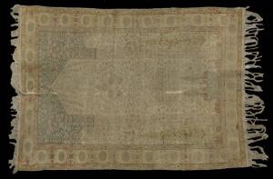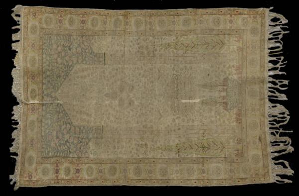 Al centro del campo abbiamo una triplice nicchia sostenuta da due coppie di esili colonne affiancate da due grandi cipressi. Queste s'impostano su basamenti rettangolari e terminano con capitelli che sostengono l'arco centrale a V rovesciata e i due laterali. Dalla nicchia cuspidata centrale (mihrab) pende un mazzo di fiori che simboleggia la lampada a olio della moschea. Alla base del mihrab trova posto una ciotola contenente due piante di cipresso. I soprarchi sono decorati da sottili tralci vegetali e inflorescenze su fondo blu. Il campo del tappeto è contornato da un bordo con rosette, un motivo che si ripete anche nel bordo esterno della cornice. Questa è dominata da una fascia centrale decorata con grandi fiori tondeggianti accostati da rosette e foglie. Una stretta fascia in armatura è presente lungo le testate, prima delle frange annodate. Sono presenti strappi piuttosto vistosi nella parte superiore e centrale. Inoltre, i colori originari non sono più identificabili. Ciò è dovuto, con ogni probabilità, all'uso di coloranti artificiali all'anilina.\nOrdito: lana; Trama: lana; Pelo: lana; Nodo: simmetrico; Densità: 2000 nodi al dm2 ca.