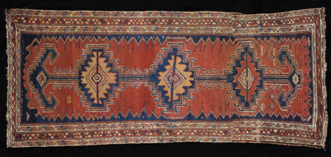 Tappeto a decorazione geometrica. Il campo blu è dominato da una forma geometrica allungata, un rettangolo rosso dal bordo smerlato contenente tre imponenti medaglioni collegati tra loro e terminanti con un motivo grossomodo a forma di freccia. Questi uncini sembrano tipici della produzione tribale e potrebbero essere interpretati come una rappresentazione molto stilizzata di teste di capra o di montone. I tre medaglioni centrali sono romboidali e presentano il profilo a gradini e uncini. Al centro di ciascun rombo sono rappresentate delle figure geometriche simili ai gul centroasiatici che, a loro volta, ospitano altre losanghe concentriche. Il resto del campo è decorato con motivi geometrici. La cornice consta di una fascia centrale seguita da due bordi solo leggermente più stetti e caratterizzati dalla medesima decorazione geometrica con motivi triangolari a colori alterni. Il tappeto è stato tagliato e riannodato.\nOrdito: lana, Trama: lana; Pelo: lana; Nodo: simmetrico; Densità: 1200 nodi al dm2