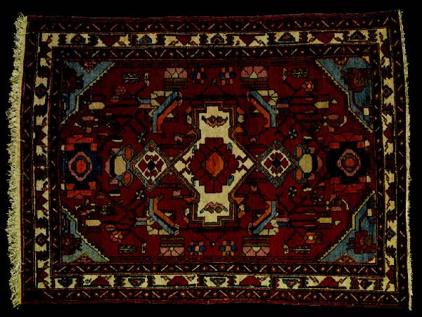 Tappeto a decorazione geometrica. Il campo esagonale presenta dei motivi decorativi di linea geometrica articolati attorno ad un medaglione centrale dalla forma quasi stellare. Nei quattro cantonali dal margine dentellato sono stati inseriti altri motivi stilizzati. La cornice è composta di una fascia centrale a fondo avorio e di due bordi laterali che alternano rosette a motivi geometrici.\nOrdito: cotone; Trama: cotone; Pelo: lana; Nodo: simmetrico; Densità: 900 nodi al dm2