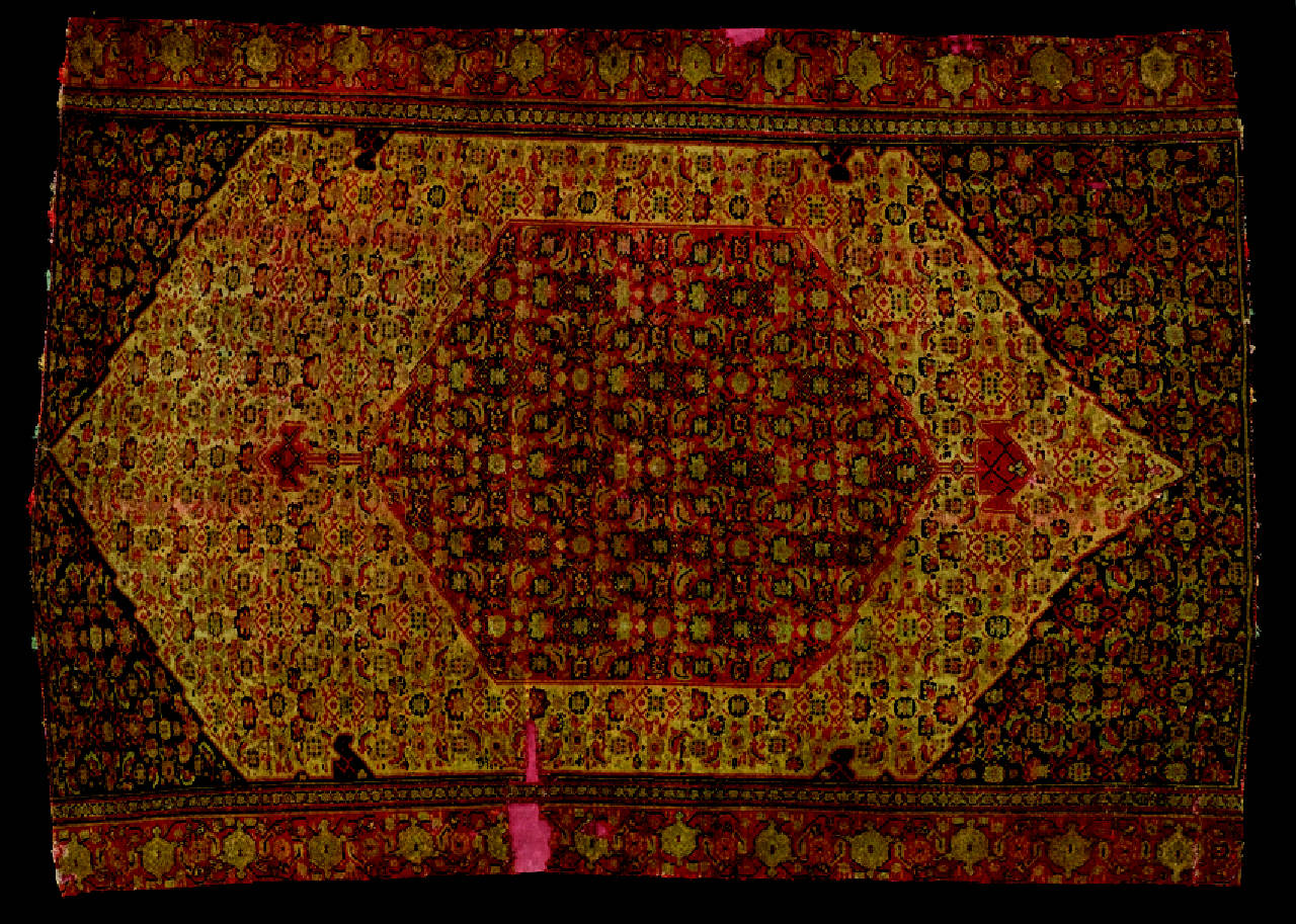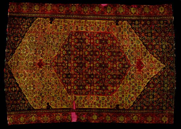 Tappeto a decorazione floreale presumibilmente annodato nella cittadina di Senneh, la moderna Sanandaj. Il campo blu è decorato da due medaglioni esagonali quasi concentrici su fondi avorio e rosso contenenti lo stesso motivo, ripeturo ed alternato di losanghe fiorite e palmette che ricopre l'intero tappeto. Si tratta di una minuta versione del cosiddetto motivo herati. Il tappeto è mutilo della cornice lungo i lati minori e del bordo esterno lungo i lati maggiori. Rimane, dunque, ben poco del motivo di bordura originario: una sottile fascia interna decorata da un minutissimo e semplificato herati verde oliva su fondo blu e da una cornice più ampia formata da rosette e fiori d'ispirazione Shah Abbas che si alternano fra loro e dai quali si diramano rami fioriti. Questo herati di bordura, prettamente lineare è detto "a tartaruga" ed è tipico dei tappeti Bijar (cfr.: P.R.J. FORD 1988, p. 88, fig. 196), un altro importante centro manifatturiero del Kurdistan persiano. \nOrdito: lana; Trama: lana; Pelo: lana; Nodo: simmetrico; Densità: 4800 nodi al dm2