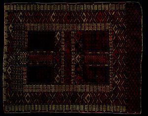 I Tekke, una fra le più importanti tribù turcomanne del XIX secolo, produssero molti ensi che erano utilizzati nelle yurte (tende) come porte. Questi manufatti sono detti anche hatchlu - cioè "croce" in armeno - proprio perché caratterizzati da una croce centrale, spesso terminante a punta, che divide il campo in quattro quarti decorati da elementi a "Y" uncinata. \nIl bordo esterno, su tre lati, presenta la tipica doppia "T" inclusa in uno sfondo bianco e denominata sainak. Il lato inferiore presenta un'alta elam ornata da minute rosette stilizzate di colori alterni e disposti in diagonale. Tale fascia ha la funzione di proteggere il campo dalla consunzione. Motivi ashik decorano la fascia centrale della cornice. \nEntrato a far parte delle collezioni museali come Yomut.\nOrdito: lana; Trama: lana; Pelo: lana; Nodo: asimmetrico; Densità: 8000 nodi al dm2