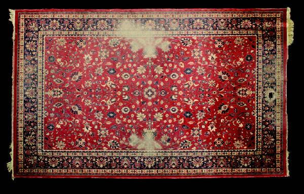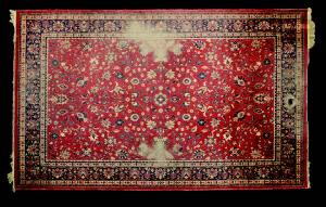 Tappeto a decorazione floreale. La decorazione del campo del tappeto è speculare sia rispetto all'asse verticale sia a quello orizzontale. La zona centrale del tappeto è costituita da una rosetta. Tutta la superficie è costellata da un mare di fiori e palmette di diverse dimensioni. I fiori si ripetono anche sul fondo beige dei quattro cantonali. La cornice è costituita da una fascia centrale e dai bordi bipartiti. La fascia centrale è decorata da palmette Shah Abbas alternate con altre inflorescenze. Il tappeto in esame è riconducibile alla produzione della Persia orientale.\nOrdito: cotone; Trama: cotone; Pelo: lana; Nodo: asimmetrico; Densità: 1500 nodi al dm2 ca.
