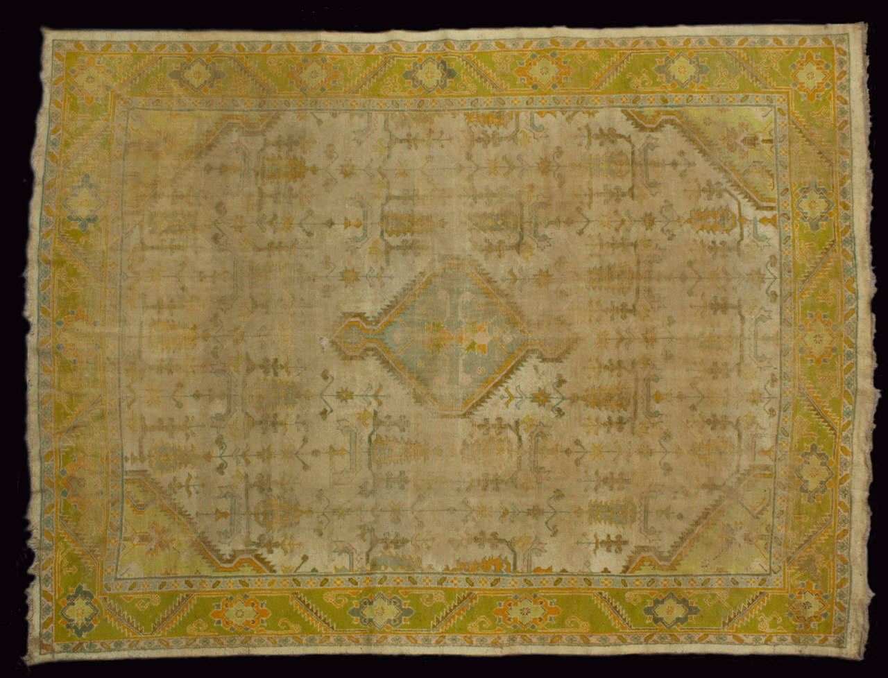 Tappeto a decorazione geometrica. Il centro del campo è dominato da un medaglione esagonale (molto simile a un rombo) terminante con due pendenti e dai contorni sfrangiati. Al centro della figura sono rappresentati fiori e foglie stilizzate. Il resto del campo reca un disegno di motivi geometrici, rosette e boccioli. Lo stesso disegno si ritrova anche nei quattro cantonali. La cornice consta di un duplice bordo con una fascia centrale. I bordi recano un'identica decorazione costituita da fiori alternati a foglie disposte in diagonale. La fascia centrale offre fiori stilizzati e foglie dal profilo seghettato. \nIl manufatto in esame è riconducibile alla Persia centro occidentale.\nOrdito: lana; Trama: lana; Pelo: lana; Nodo: simmetrico; Densità: 1200 nodi al dm2 ca.