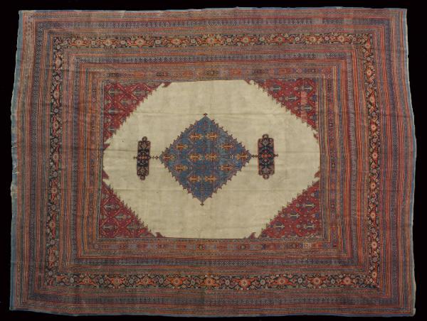 Tappeto a medaglione. Il campo del tappeto è dominato da un ottagono contenente al centro un medaglione romboidale con due pendenti a forma di cartiglio. Il medaglione, definito da un contorno a uncini, è riempito da dodici motivi ornamentali entro uno schema a losanga. Lo stesso motivo, solo su fondo rosso, si ritrova nei quattro cantonali. \nLa cornice è notevolmente ampia e importante. E' costituita da una fascia centrale ornata da palmette e roselline e da numerosi bordi alcuni dei quali decorati da cartigli.\nOrdito: cotone; Trama: cotone; Pelo: lana; Nodo: asimmetrico; Densità: 750 nodi al dm2 ca.