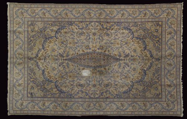 Tappeto a decorazione floreale. Il campo del tappeto è decorato da un medaglione ovale molto schiacciato collocato al centro di un cartiglio polilobato. Tutta la superficie del campo è abitata da minute foglioline azzurre e color cammello. La cornice è costituita dai bordi sottili decorati con motivi geometrici e da una fascia centrale ornata da tralci fogliati disposti a onda.\nOrdito: lana; Trama: lana; Pelo: lana; Nodo: simmetrico; Densità: 400 nodi al dm2 ca.