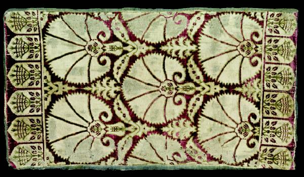 Il disegno consiste in file sfalsate di grandi fioriture stilizzate di garofani broccati su fondo rosso. Ogni forma floreale è composita; da un motivo ad arabesco si aprono due foglie dal profilo seghettato (saz) che al centro hanno un tulipano stilizzato da cui hanno origine sette petali di garofano sfrangiati. Lungo i lati corti ci sono sei cartelle contenenti ancora motivi floreali stilizzati. \nQuello del garofano stilizzato e aperto è uno dei motivi più popolari fra i tessuti prodotti a Bursa dalle manifatture imperiali ed eseguito in numerose varianti.