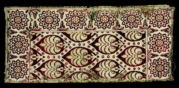 Entro una griglia ogivale si stagliano, su fondo rosso, piccoli tulipani stilizzati dai quali si originano palmette dal profilo sfrangiato. La griglia presenta minute rosette rosse su fondo chiaro. La cornice é costituita da carnose inflorescenze alternate a coppie di tulipani contrapposti. \nQuesto tipo di decorazione era molto diffuso ed era prodotto sia per il mercato locale sia per l'esportazione in Occidente.\nIl tessuto è citato nell'elenco redatto dal dott. Candrini alla posizione n. 28.