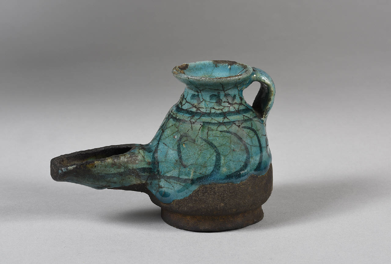 Piccola lampada ad olio a forma di vasetto con beccuccio laterale molto sporgente. Sul corpo sono piccoli disegni astratti.