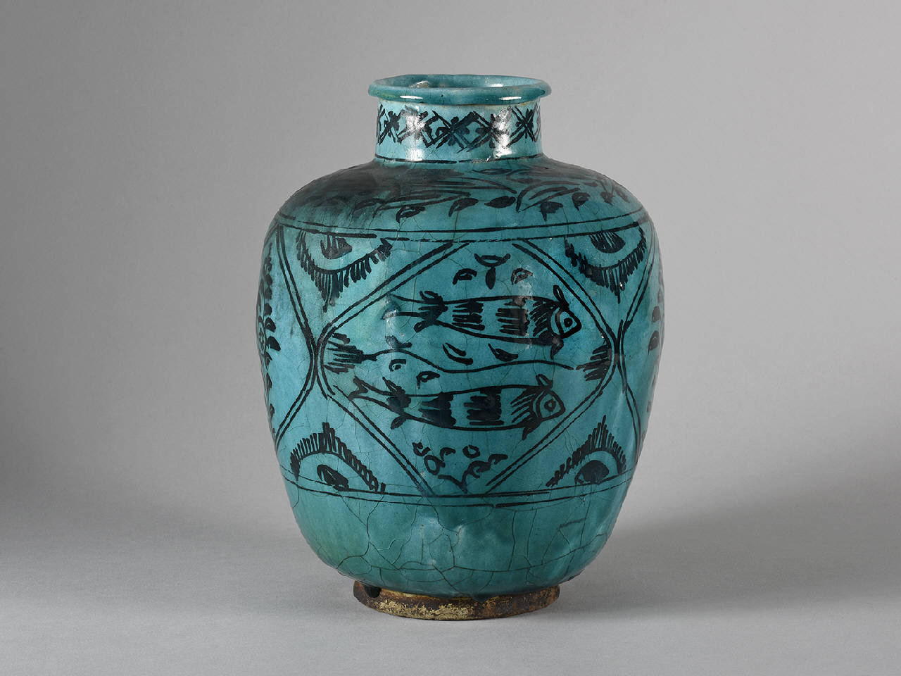 Vaso decorato in nero sotto invetriatura turchese. Corpo leggermente piriforme, corto collo cilindrico e orlo rovesciato. Sul ventre, entro una doppia linea, sono decorati grandi rombi delimitati da una doppia linea e abitati da pianticelle stilizzate e coppie di pesci. Negli intervalli sono presenti fregi arcuati. La spalla è ornata da un sottile tralcio fogliato mentre il collo presenta un intreccio geometrico continuo.