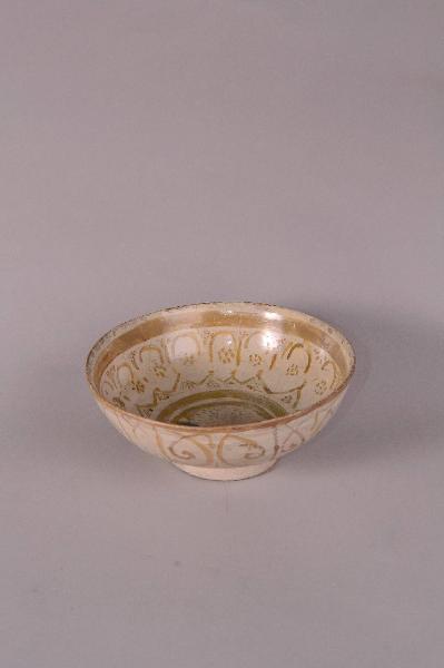 - NOTIZIE STORICO CRITICHE La coppa è realizzata in lustro metallico, tecnica decorativa applicata utilizzata a partire dalla metà del IX secolo. Si trattava di una composizione a base di sali d'argento e rame applicata sullo smalto già cotto. L'oggetto così decorato veniva rimesso in forno, in atmosfera povera di ossigeno: i sali penetravano nella superficie della vetrina e prendevano quel caratteristico colore metallico di varia tonalità, fra il dorato e il rosso rame. Questa tecnica fu ampiamente utilizzata in Persia nel periodo selgiuchide.