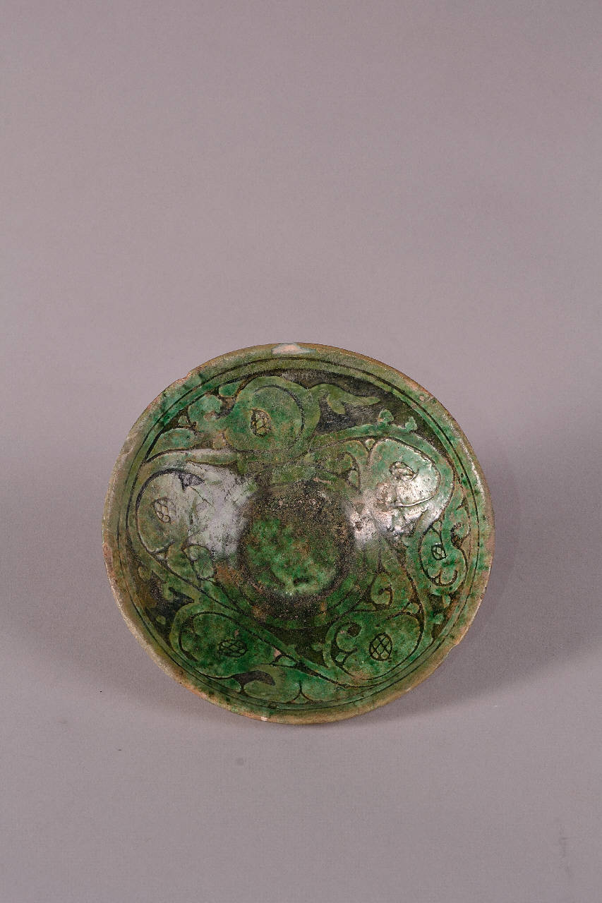 Coppa in terracotta ingobbiata in bianco, intagliata e con un'invetriatura piombifera verde (champlevé). L'interno della coppa è interamente decorato da volute foliate ad andamento curvilineo.