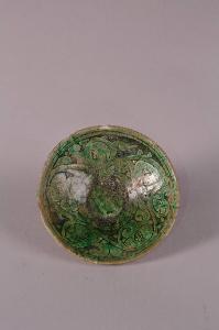 • NOTIZIE STORICO CRITICHE Questi manufatti, noti con il nome di Garrus (termine che si riferisce alla zona geografica di provenienza che è identificabile in una zona compresa tra Qazvin, Zanjan e Takht-i Sulayman, nella Persia occidentale) si caratterizzano per il corpo ceramico ingobbiato e in parte asportato da uno strumento acuminato fino a creare, come nel caso in esame, un effetto a rilievo. L'oggetto, coperto dall'invetriatura (verde in questo oggetto ma a volte anche giallo /bruno), veniva cotto. \nLa "ceramica del Garrus" è stata a lungo conosciuta con il nome di garbì (con questo nome è entrata a far parte delle collezioni museali) appellativo dato agli zoroastriani adoratori del fuoco che si ritenevano autori di vasellame con queste caratteristiche.