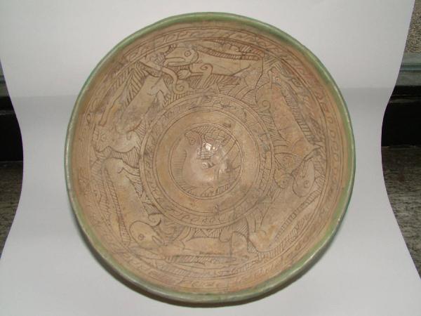 - NOTIZIE STORICO CRITICHE Gli animali fantastici che decorano il manufatto e, in particolare, l'uccello al centro della coppa, si riscontrano nella tipologia dei metalli samanidi prodotti tra il X e l'XI secolo (cfr. E.J. GRUBE 1994, pp. 86-87). \nLe caratteristiche tecniche e stilistiche permettono di attribuire questa coppa appartiene alla produzione di Amùl. Il vasellame della cittadina nei pressi del Mar Caspio si caratterizza per la presenza di decorazioni ottenute a "sgraffio", ossia mediante incisione e asportazione dell'ingobbio. E' possibile un confronto con la coppa conservata nel Museo di Teheran (cfr: G. FEHERVARI 1985, p. 112).