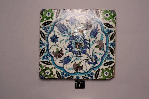 - NOTIZIE STORICO CRITICHE La decorazione di questa mattonella deriva dai prototipi di Iznik, il principale centro manifatturiero anatolico dei secoli XVI e XVII. A tal proposito va precisato che durante la seconda metà del XVI secolo in Siria furono prodotte ceramiche che imitavano lo stile anatolico cosiddetto "di Damasco" (1530-1550). Moschee come la Süleymaniye, Dervish Pasha, Sinaniye, la camera contenente il cenotafio del Saladino, sono riccamente decorate con mattonelle che hanno disegni molto simili a quelli della contemporanea ceramica di Iznik.\nUn pannello di mattonelle di questo gruppo si trova al Victoria and Albert Museum di Londra (cfr. G. FEHERVARI 1985, p. 222) con una datazione alla fine del XVI secolo. \nUna mattonella pressoché identica sia nella decorazione sia nelle dimensioni (25,5 x 25,5 cm.) è presente nel catalogo d'asta Sotheby's (asta dell'11 ottobre 1989) con una datazione al XVII secolo ( proposta anche nella precedente scheda catalografica del museo). \nIl presente oggetto è da mettere in relazione con la mattonella inventariata n. ISL 106.