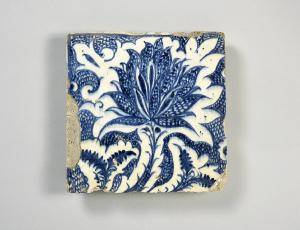 Mattonella quadrata dipinta in blu e bianco. La decorazione consiste in un fiore a larghi petali aperti sopra uno stelo leggermente ricurvo. Tutto il fiore è profilato in bianco mentre il resto della superficie della mattonella è decorato da tratti incrociati.