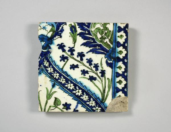 Mattonella quadrata dipinta in blu, turchese, verde salvia su fondo bianco sotto un'invetriatura trasparente. La decorazione è divisa in due bande. In quella più sottile si osserva un bordo a palmette bianche su fondo blu. La superficie della mattonella è decorata da una fascia arcuata dal profilo seghettato e abitata da minuti fiorellini, da un centrale tralcio fiorito e dalla porzione di una carnosa palmetta. Per la decorazione il presente manufatto può essere messo in relazione con le mattonelle n. ISL 118 e ISL 119. Simile per decorazione alla mattonella inv. ISL 158.\nSul mercato antiquariale internazionale sono spesso presenti mattonelle con decorazione pressoché uguale.
