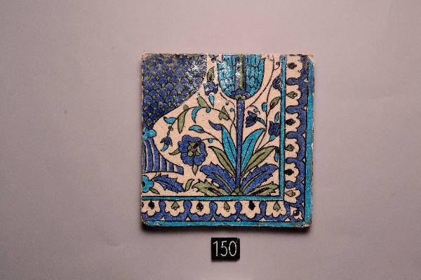Mattonella quadrata, angolo di un pannello, decorata in blu, turchese, verde chiaro e bianco sotto invetriatura trasparente. La decorazione consiste nella porzione di un vaso affiancato da un cipresso. Il bordo è abitato da palmette. \nPer un certo periodo la mattonella in esame è stata parte di un pannello con le mattonelle inv. ISL 151, ISL 152, ISL 153, ISL 154, ISL 155, ISL 156, ISL 157 con le quali completava il disegno.
